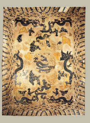 On display 10 rare carpets woven on silk, metal thread, silver and gold, commissioned by the Imperial Families to decorate the pavillions of the Forbidden City.